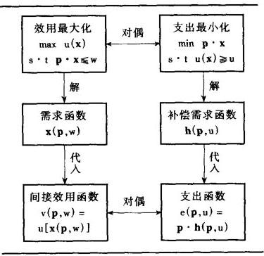 | 释义 | 支出函数和效用函数的对偶性 在消费者理论中,若给定消费者的效用函数u(·),则对应于指定的效用水平u和价格p=(p1…,pn),支出函数为: e(p,u)=m 反之,如果知道消费者的支出函数e(p,u),则消费者的效用函数可由下式求出 u(x)=m 其中U是u(x)的值域,P={p|p>0} 消费理论中的对偶关系可总结成下表