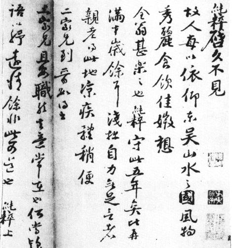 【赏析】: 尺牍书法,多是无意于书。因此以完美的标凖去衡量的话未免过于苛刻。更何况是对待像范纯粹这类作者的作品呢?虽然从欣赏角度我们可以拿最高的标凖去衡量它,以此证明它的一无是处。但从学习的角度,我们还应该看到许多我们自己尙未达到,而又値得学习的地方。以这件作品来说,我认爲有许多局部的地方处理得极爲精彩。如第四行的“乐之”,第五行的“无足”,第六行的“得比”等字,不但在结体上注意了空间的大小、穿揷、挪让等呼应顾盼关係,而且在用笔上还注意了中锋、偏锋、点线大小、虚实、方圆、曲直等变化。而这些变化都能在瞬间内完成,同时又不影响其随意、自然以及规範性,由此可见作者的书法根基颇深,对用笔与线条的控制能力也极强,不但能够掌握它,控制它,而且还能自如地运用它,眞所谓“随心所欲而不逾矩”也。 |