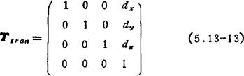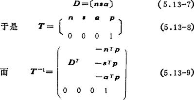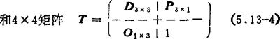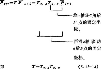 齐次变换矩阵的合成:矩阵合成时必须注意矩阵乘法的次序。设开始时参考坐标系0'-ξηζ和固定坐标系0-xyz是重合的,因此齐次变换矩阵T是4×4的单位矩阵I4。由(5.13-5)式可知,空间一点P的位置坐标在参考坐标系和固定坐标系是相同的。如果参考坐标系连同点P一起绕固定坐标系轴x,y和z移动或转动,则