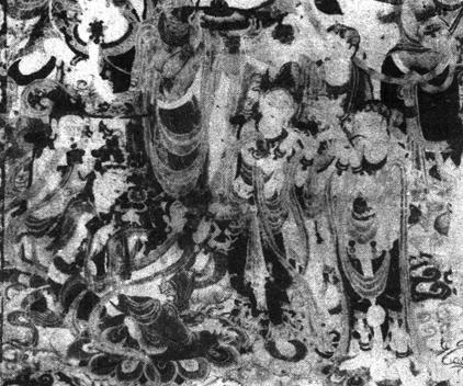 【作品赏析】: 文殊菩萨也称文殊师利,按佛经所记是智慧之神。 菩萨顶结五髻以表大日之五智,手持剑以表智慧之利刃,乘狮子以表智慧之威猛。常与普贤相对,为释迦牟尼胁侍。 在敦煌壁画中,文殊变很盛行。第159窟西壁北侧,绘于中唐时期的文殊变是较有代表性的一幅。 文殊菩萨乘狮子,神态雍容、安详;下面是供养菩萨和伎乐,轻飏的飘带和有著强烈装饰性的云彩,把观众带入了一个恍若仙境的气氛之中。画面用色淡雅,大量的石绿色表现出宁静、超俗的境界。 线描技法非常娴熟,不论是供养菩萨飘带的流动,还是各种人物体态和衣纹的处理,都很自然和谐。在构图上富于装饰性,文殊左右的菩萨排列稍嫌平板,下方的三组人物却富于变化。 左方三个供养菩萨表情各异,排列整齐;中间三伎乐呈三角形排列,后面一组人物又与前面人物相呼应。 画家擅长于人物神态的刻画,如左下角三个供养菩萨,一人眼向上瞟,喜形于色,一人目视下,神态矜持,一人侧面,表情专注。右下一组人物则神态安详。最富于魅力的是中间一组伎乐,执拍板者眉飞色舞,奏笛和笙者神情专注,仿佛已陶醉在美妙的音乐之中,特别是奏笙者的脚趾动作,似乎在应和著乐曲的节奏。 这些细节的表现都是颇费匠心的。。  中唐 壁画 敦煌莫高窟 159窟 纵45厘米 横58厘米 |