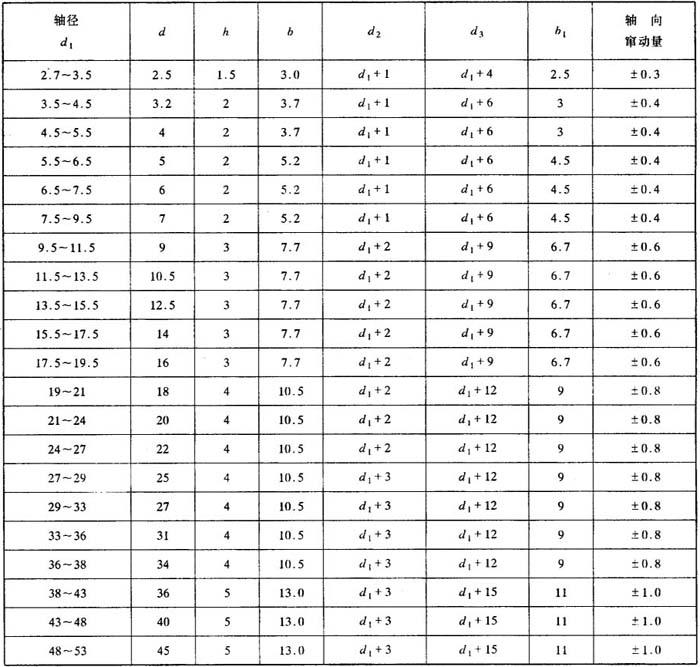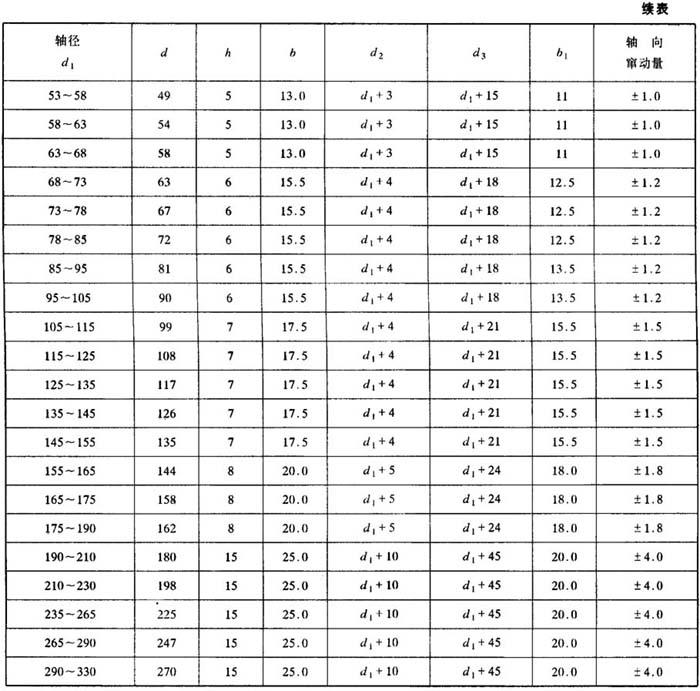 | 释义 | 旋转轴用防尘圈 旋转轴用防尘圈是一种用于旋转轴的端面密封的防尘装置。其截面形状如图26.4-2所示。该防尘圈的端面密封唇缘,紧紧贴合于轴颈表面,随轴转动时,由于离心力的作用,斜面上的泥水、尘土等均被抛甩离开密封部位。从而起到防尘和密封作用。见图26.4-2。 旋转轴用防尘圈的特点是:结构简单、装拆方便,能适应轴的偏心、振摆和跳动。防尘效果好。对轴无磨损。 旋转轴用防尘圈的安装沟槽型式和尺寸如表26.4-3所示。 表26.4-3 旋转轴防尘圈安装沟槽尺寸系列 (参见图26.4-2) 单位:mm