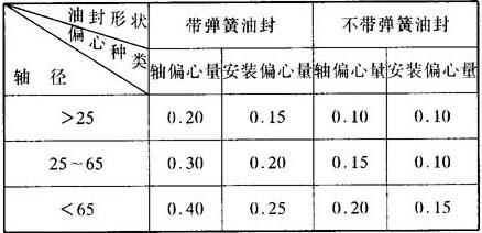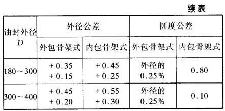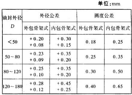 ·应保证油封唇缘对旋转轴的过盈量要求,其值如表26.5-4所示。 表26.5-4 油封唇对轴的过盈量  ·为保证密封效果,油封的外径和圆度公差见表26.5-5(a)。 表26.5-5(a) 油封外径公差及圆度公差   ·油封在使用过程中的最大偏心量也应严加控制,以确保密封效果,其范围如表26.5-5(b)所示。 表26.5-5(b) 油封最大允许偏心量 单位:mm  ·旋转轴的表面硬度,一般取HRC30~40。当油封基体材料的表面,即其密封副滑移的表面,粘贴有聚四氟乙烯树脂,成为复合结构时,或者在橡胶基体材料的表层,作浸氟或等离子喷氟处理时,轴的表面硬度应取HRC50~60。 |