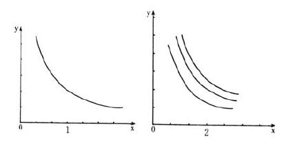 指能够使消费者得到同样满足程度的两种或两组商品的不同组合的轨迹,亦称效用等高线,是现代西方经济学的理论分析工具、序数效用分析的基础。 在平面坐标图上,如果用X轴、Y轴分别代表两种(两组)不同的商品数量,把代表相同的总效用的各点连接起来即为无差异曲线,如图1。这条曲线上任意一点给消费者带来的满足程度都相同。曲线向右下方倾斜,其斜率为负值,表明两种(两组)产品在满足消费者需要方面可以相互替代,一种商品增加,另一种商品必相应地减少。无差异曲线是在一定的收入和价格水平下得出的,收入与价格不同,消费者的满足程度也不相同,所以在同一平面图上可以产生若干条无差异曲线,如图2。 距离原点越远的无差异曲线所代表的两种(两组)商品的数量就越多,满足程度也就越高;不同的无差异曲线代表不同的满足程度,因此永远不会相交。