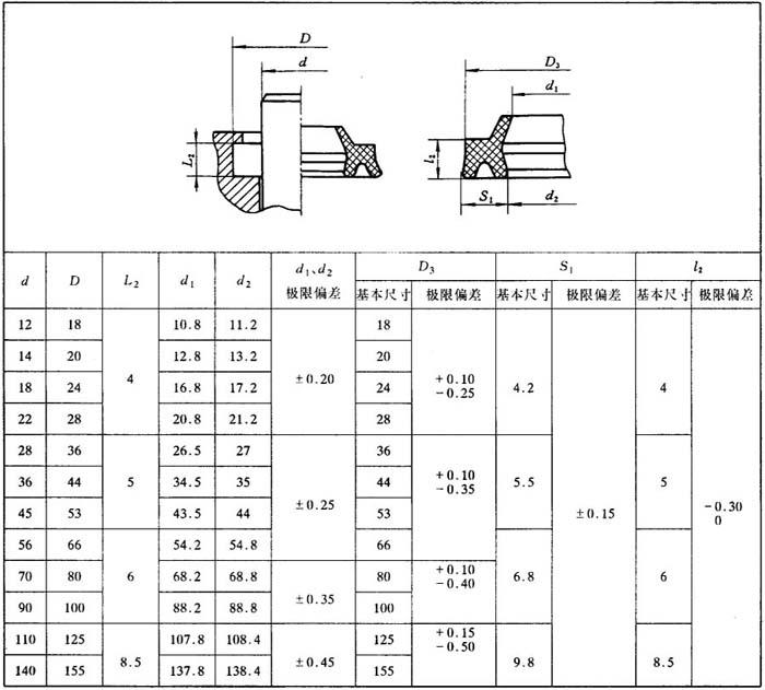 | 释义 | 普通型防尘圈 普通型防尘圈呈舌形结构,分为有骨架式和无骨架式。普通型防尘圈,系单唇型防尘圈,其支承部的刚度较好、结构简单、装拆方便。使用的材料,一般有丁腈橡胶和聚氨脂橡胶。 表26.4-1为GB6578-86《液压缸活塞杆用防尘圈沟槽型式、尺寸和公差》国家标准。 表26.4-1(a) A型沟槽尺寸和公差 单位:mm