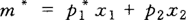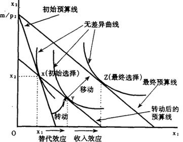 初始预算约束线和最终预算约束线的位置如图所示。由于是商品1的价格下降,最终预算约束线实际上是绕纵截矩m/p2向右旋转(逆时针方向旋转)而成的。上图是把预算线的这种转动分为了两步,第一步,是预算线绕著原消费束转动,斜率变为新的相对价格,这就是图中所标明的“转动后的预算线”。 第二步,是转动后的预算线向右上方平移得到最终预算线。 这种转动-移动步骤,使我们能够方便地把需求变动分解为两部分。第一步的转动是预算线斜率发生变化,而购买力保持不变的一种变动;而第二步则是斜率保持不变,而购买力发生变化的一种变动。 当然,事实上消费者仅仅是根据价格变动来作出新的消费选择,他不会有意的将这两步分开进行,但这种假设的分解方法却使我们的分析既富有洞察力,又变得简单明了。 我们来看看转动后的预算线的经济学意义。这条线同最终预算约束线具有相同的斜率,即具有相同的相对价格。但它们的纵截矩不同,所以这两条预算约束线所代表的货币收入也不同。由于初始消费束(x1,x2)仍处在转动后的预算约束线上,这表明初始消费束在转动后的预算约束线上恰好是支付得起的,这就表明消费者的购买力保持不变。 我们来计算一下为使初始消费束恰好支付得起,货币收入的调整量应是多少。 设m*为恰好使初始消费束支付得起的货币收入量,这个货币收入量就是转动后的预算线所代表的货币收入量。既然,(x1,x2)在(p1,p2,m)和 m=p1x1+p2x2