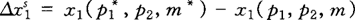 这个方程表明,为使初始消费束在新的价格水平上仍恰好支付得起,货币收入必须作出的变动等于商品1的初始消费量乘以商品1的价格变动量。注意,收入和价格的变动方向是相同的。 商品1的价格下降的话,收入的调整方向就一定是负向的。原因在于商品的价格下降,消费者的购买力就提高,要保持购买力不变,就必须减少货币收入;同样,当商品价格上升时,消费者的购买力就下降,要保持购买力不变,货币收入就要增加。 尽管初始消费束仍能支付得起,但一般它不是转动后的预算线上的最佳消费束。在上图中,我们用Y表示转动后预算线上的最佳消费束,这个消费束,就是我们在改变价格,然后调整货币收入,使购买力保持不变后得到的最佳消费束。 从初始消费束到这个最佳消费束的移动,反映了价格变动但购买力保持不变时消费者如何用一种商品来替代另一种商品。 利用需求函数,我们可以准确地计算出替代效应△xs的大小。 我们以商品1为例,假设商品1的需求函数x1(户1,p2,m),那么: