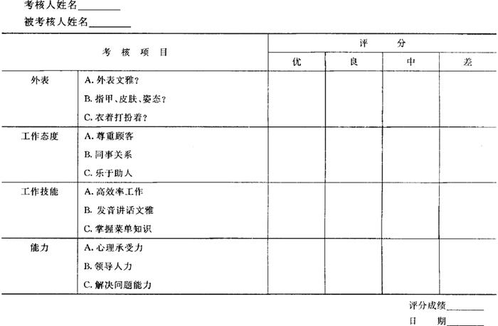 | 释义 | 服务业的人事考核管理 服务业是通过职工向顾客提供劳务为主的服务性企业,加强人事考核管理充分调动人的因素,就显得尤其重要。 1.人事考核制度的建立 服务企业利用人事考核方式来确定职工工资待遇和职务晋升,调动职工积极性,提高工作效率,增加企业的盈利水平。 进行人事考核首先应建立人事考核制度。各部门负责人和有关管理人员都要参加讨论,同时也应召开职工会议,决定适合本企业的人事考核制度。 其次,进行人事考核应确定每隔一定的时间进行一次考核,最好是每隔半年考核一次,考核间隔时间过长,不利于激发职工的积极性间隔太短,则变成例行公事,而且容易造成人心不稳定。 再次,进行人事考核应与职工的工资额挂起钩来,考核成绩好,相应工资增加。考核成绩不好,效率低,则工资减少。同时每项考核应设置一个上限,对工资总额加以控制。 人事考核关系到每个职工的切身关系,也关系到本企业的经营发展,企业应提高人事考核的可靠性。方法有多种,这里主要介绍两种: (1)增加考核内容 提高人事考核的可靠性,不能权凭一个总的印象,如只对员工的工作效率进行考核评比,应该增加考核的内容,其考核内容应包括业务知识,正确性,领导能力与人品、礼貌、服装整洁、工作质量等。某服务企业考核表如下所示: 某企业职工考核表