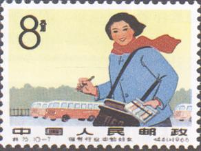 发行日期:1966年5月10日 齿孔度数: 印刷版别:影写版 图幅:36.5×26 全张枚数:50(5×10) 设计者:卢天骄、杨白子、陈晓聪、潘可明 印刷:北京邮票厂           (1)8分 一切工作为革命 600万枚 (2)8分 列车员 600万枚 (3)8分 农村卫生员 600万枚 (4)8分 保育员 600万枚 (5)8分 清洁员 600万枚 (6)8分 理发员 600万枚 (7)8分 汽车服务员 600万枚 (8)8分 背篓商店售货员 600万枚 (9)8分 食堂服务员 600万枚 (10)8分 乡村邮递员 600万枚 (1)-(10) 10枚全 |