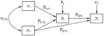 由相关的外生变量产生的效应。在下面的路径图中,x1与x2是相关的外生变量,y1和y2是内生变量(均已标准化),y1与x2间的相关系数ry1x11=Py1x2+Px1rx,其中第一项是直接效应,第二项是未分解效应。
