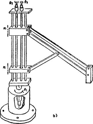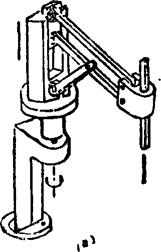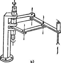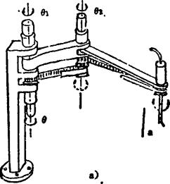 该机构由两个(或三个)水平转动θθ和一个铅直移动S三个(或四个)关节构成。为减轻臂部重量,可引入带传动(如图a)或连杆机构传动(如图b).常作为装配机器人的主体机构。 例5.2-220 多关节型(θθθ)