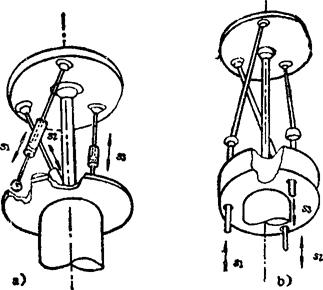 图a)、b)分别为3-SPS型、3-PSS型。其中间杆的一端与臂刚性固连,另一端与手部平板以球面副相联接。两机构均为3个自由度,分别由三个驱动缸的伸缩控制手部的三维姿态变化。 |