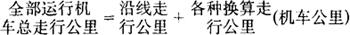 | 释义 | 机车总走行公里 一个机务段、铁路分局或铁路局以至全国铁路在一定时期内全部运行机车走行的公里总和,(包括本务机车走行公里、双机牵引和补机走行公里、单机走行公里、其他列车机车走行公里以及调车机车工作和其他工作机车的换算走行公里)。 可用下式表示: