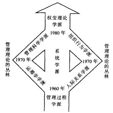 美国管理学者约翰·莫尔斯(John Morse)和杰伊·洛希(Jay W.Lorsch)在1970年5~6月号的《哈佛工商评论》上曾发表《超Y理论》一文,该文指出了所谓X理论和Y理论的适用环境,并且提出了权变性的超Y理论,从而奠定了权变管理的思想基础。 权变管理学派集各家学说于一体,使管理理论更具操作性,特别是所阐明的权变观念及权变的管理方法,已为人们普遍接受。 权变管理的思想理论一经提出,便得到许多学者的高度评价,认为它能使学派林立的管理理论“走出丛林”。美国管理学者弗雷德·卢山斯(Fred Luthans)在1973年发表的《管理的权变理论,走出丛林之路》一文中,如图表明权变理论能够引导管理学走出“管理理论的丛林”。 权变管理学派本身并没有发明多少管理方法或技术。因为它主要关心在什么环境下有什么相应的管理方法或技术可资采用,因而它在吸收其他许多学派的研究成果的基础上,著眼于分析环境与管理理论之间的对应关系,即在何时、何地、何条件下的有效管理方式。 特别是在战略及计划、组织结构设计、领导方式等方面,通过大量的实验研究及问卷调查,提出了许多权变性的管理方法。 |