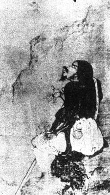 【作品赏析】: 此图以水墨画古代传说的八仙之一铁拐李。 李仙侧坐石上,神情生肃,鹰隼般锐劲的目光令人触目惊心。其外貌的丑陋和内心的善美相得益彰。 全幅笔法简劲,略仿梁楷风格的减笔兼破墨。 衣纹用线富于变化,肌肉略加晕染。款识“秋月”二字,已残缺不全。 。【作者介绍】: 颜辉字秋月,生卒年不详,约活跃于宋未元初,庐陵(今江西吉安)人。 工书善画,为当时最著名的道释人物画家,特别善于画鬼。其画风源出南宋刘、李、马、夏一派,又由宋末梁楷、牧溪等名家中衍变,功力极深,据说在元大德年间(1297-1307)留有许多道观壁画。人称其“笔法奇绝,八面有生意。”直到明末,还有许多画家追慕其画风。 颜辉在日本影响尤其大,日本画圣雪舟等杨就对其极为推。。  元 颜辉 轴 绢本水墨 纵146.5厘米 横72厘米 藏日本京都市知恩寺 |