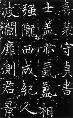 唐·裴守眞书于贞观二十三年(649)。搨本。行书。241×89cm。西安市郭家滩出土(1954)。陕西省博物馆西安碑林藏。刊于日本《中国书道全集》(三)。 【赏析】: 此碑风格淸刚秀丽,瘦硬严谨。用笔结体极似褚遂良,一望而知从龙藏寺碑一脉而来。从褚遂良、薛稷、裴守眞诸人之书风,可见初唐书法审美风尙之一斑。 此书虽似褚书,却不能如褚之瘦中见腴,灵动自如。而失之拘谨,有单薄之感。 |