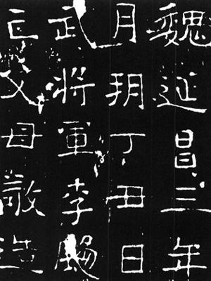 【简介】: 北魏延昌三年(514)八月刻。正书。五行,行六字。《中国书法大辞典》著录。 【赏析】:  当我们在北魏的衆多碑刻中遨游,都会爲碑刻中那逼人的气势所震撼。截铁斩钉、峻朴骠悍往往在许多人心目中成了魏碑的代名词。但如具体地去认识,又可以发现魏碑书法其实是极爲多姿多彩的。《李飏造像记》给我们带来了淸劲温和之风,其线条纤丽,方圆交融,挺劲而又具有优美舒缓的弧度。意味是那样朗健、淸润、细腻、文雅。其结字端方挺健,隷法隐存,境界淸空。 这方碑刻把我们的思緖带到了初唐。虞世南、褚遂良的楷书,尽管都在二王笼罩之下,但与此碑亦有气息相通之处。那轻健舒展,淸和淡远,绝缘于霸悍凌厉等,都使我们不难沟通它们之间的内在联繫。 |
