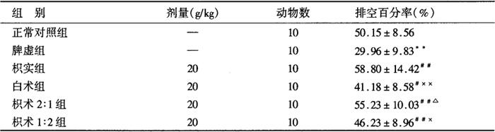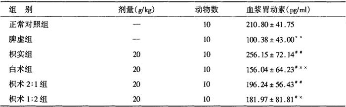 从表9-2-18可知,食积小鼠血浆胃动素含量小低于正常对照组,两组间差异非常显著(P<0.01)。单味枳实、白术及其配伍皆提高食积小鼠血浆胃动素含量,枳实组与与食积组、白术组比差异非常显著(P<0.01);白术组与食积组比差异显著(P<0.05);枳术2∶1组与食积组比差异非常显著(P<0.01);枳术1∶2组与食积组、枳实组比差异显著(P<0.05)。 9-2-18 单味枳实、白术及其配伍对食积小鼠血浆胃动素的影响(