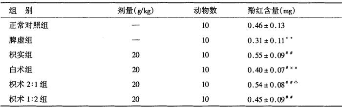 从上表可知,食积组小鼠胃酚排空率明显低于正常对照组,两组间差异非常显著(P<0.01);单味枳实、白术及其配伍皆提高食积小鼠办酚红排空率,枳实组、枳实2∶1组、枳术1∶2组与枳实1∶2组比差异非常显著(P<0.01);白术组与正常对照组比差异显著(P<0.05);白术组与枳实组比差异显著(P<0.01);枳术2∶1组与白术组比差异显著(P<0.01);枳术1∶2组与白术组比差异显著(P<0.05);枳术1∶2组与枳实组比差异显著(P<0.05)。 从表9-2-17可知,食积小鼠小肠后三段酚红含量明显低于正常组对照组,两组间差异非常显著(P<0.01);单味枳实、白术及其配伍皆提高食积小鼠小肠后三段酚红含量,枳实组、枳实2∶1组、枳实1∶2组与食积组比差异非常显著(P<0.01);白术组与食积组比差异显著(P<0.05);白术组与枳实组比差异非常显著(P<0.01);与枳术2∶1组比差异显著(P<0.05)。 9-2-17 单味枳实、白术及其配伍对食积小鼠小肠酚红推进的影响(