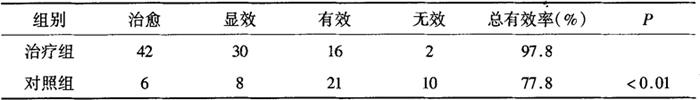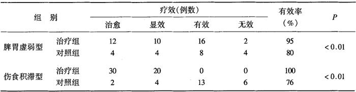 3.保肝、利胆作用 按每日4g/kg给小鼠灌服本药能明显增加正常小鼠肝糖原和降低血糖。实验还表明,本药有增加大鼠胆汁分泌和抑制正常小鼠胃肠推进趋势[14]。另有报道,小鼠内服本方煎剂有防止四氯化碳引起的肝糖原减少的作用[14]。 4.其他 按每日8g/kg给药能明显提高正常小鼠腹腔巨噬细胞对炭末的吞噬能力,提高小鼠耐缺氧能力[15]。 【临床应用】 1.治疗胃下垂 周氏[16]用枳术汤重剂治疗胃下垂32例,男9例,女23例;年龄最大68岁,最小23岁,30岁以下7例,32岁至40岁16例,40岁以上9例;病程在2年以下者10例,2至5年者11例,6至10年者8例,10年以上者3例。全部病例均经X线钡餐造影检查而确诊(胃张力明显减低,胃小弯角切迹在骼嵴连线以下4cm至12cm),其中经纤维胃镜检查合并浅表性胃炎者19例。主要临床表现:脘腹痞痛,或隐痛或坠痛,空腹时轻,进食后重,嗳气不舒,胃脘部有振水声,纳食减少,形体消瘦,大便薄溏或干结等。基本方:枳实、白术各50g。加减法:肝郁气滞明显者加柴胡、佛手柑、郁金等;脾胃气虚寒者加干姜、党参等;脾胃郁热者加黄连、吴茱萸等;湿阻脾胃加川朴、苍术等,纳食减少者加山楂、神曲等;大便干结者加火麻仁、柏子仁等;大便溏薄者加怀山药、煨葛根等。症状改善后,以枳实、白术减量巩固。结果9例痊愈(胃小弯角切迹回升至髂嵴连线以上,临床症状及体征消失);12例显效(胃小弯角切迹位置有明显上升,临床症状及体征明显改善);8例有效(胃小弯角切迹有所上升,临床症状及体征有所改善);3例无效(胃小弯角切迹位置及临床症状和体征无变化)。服药时间最长90d,最短21d,这与病变程度与年龄有关,3例无效病人中,2例为60岁以上年龄,1例为胃下垂超过12cm者。郭剑新[17]以枳术汤加升麻治疗胃下垂34例,随证加减,煎服,总有效率97.1%。 2.治疗慢性胃炎胃脘痛 杜氏用枳术汤合芍药甘草汤加味治疗慢性胃炎70例,其中男性48例,女性22例;年龄30岁以下者16例,30~50岁38例,50岁以上者16例,病程在两年以下15例,2~5年者4例,6~10年者15例,10年以上者4例。 慢性浅表性胃炎38例,慢性肥厚性胃炎19例,胆汁反流性胃炎9例,慢性萎缩性胃炎4例。肝气犯胃,加香附、广郁金;肝胃郁热加左金丸、山栀、大黄、佛手;脾胃阴虚去柴胡、白扁豆,加沙参、麦冬、生地、石斛;脾胃虚寒,加良姜、黄芪;重用白扁豆,加失笑散、党参。结果:痊愈(经治疗3个月后胃镜或X线钡餐复查正常,症状消失)16例;显效(胃镜或X线复查好转,症状基本消失或部分消失)51例;无效(胃镜或X线钡餐复查无变化,症状无改善)3例。总有效率为95.71%[8]。 王氏用枳术丸加味治疗胃脘痛效好[19]。基本方:炒枳实80g,炒白术60g,醋元胡50g。共研细粉,每日服3次,每次7g,白开水送下,偏重气滞,枳实加至12g,偏热者,白术生用,另加冰片2g,偏寒者加肉桂40g,病久痛甚加香附50g,吞酸糟杂加乌贼骨80g。 3.治疗痞满证 丁氏[20]等利用现代科学技术,将枳术丸剂型改良为冲剂。共观察治疗135例。其中门诊85例,住院50例,男性45例,女性90例;年龄20~62年,平均42.5岁。按就诊顺序,随机平行分为治疗组、对照组:治疗组90例,男性30例,女性60例,平均年龄44.6岁,对照组45岁,男性15例,女性30例,平均年龄43.5岁。中医辨证分型:脾胃虚弱型60例,伤食积滞型75例。其中治疗组脾胃虚弱型40例,伤食积滞型50例;对照组脾胃虚弱型20,伤食积滞型25例。病情程度:轻度(+)27例,中度( 中医诊断:符合痞满证的诊断(诊断标准参考中华人民共和国卫生部制定的“中药新药治疗痞满证的临床研究指导原则”中的相关标准),中医辩证符合脾胃虚弱的患者以及因饮食不节、食滞未消而作痞满者(伤食积滞型)均为观察对象。西医诊断:经胃镜、B超、肝功能等检查,排除胃、十二指肠及肝、胆、胰等器质病变,以胃肠动力学障碍为主要表现的“功能性消化不良”者。参照“1993年中华人民共和国制定的中药新药治疗痞满证的临床研究指导原则“中的相关标准,分+、 治愈:痞满症状消失。显效:痞满症状明显减轻,由( 无效:痞满症状减轻不及+或加重。治疗组口服枳术冲剂,每日2次,每次10g。对照组服用枳术丸,每日2次,每次6g。服药时间最长不超过2周。观察期间不服用其他药物。枳术冲剂与枳术丸采用同一批原药材按标准制备并提供。主要观察病人胃部饱胀、胀痛、饮食、嗳气、大便等情况。治疗前后给予分别记录+、 从表9-2-19可知,治疗组的总有效率为97.8%;对照组总有效率为77.8%。两组具有显著差异(P<0.01)。 9-2-19 总疗效比较