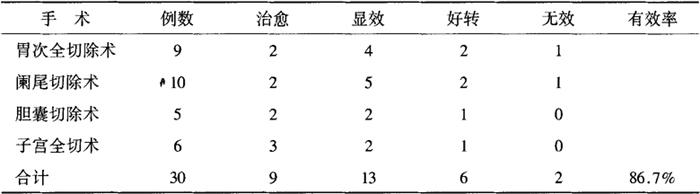 表9-2-21表明治疗组各型疗效均高于对照组。治疗组二证型相同,经Ridit分析检验,无显著差异(P>0.05)。说明枳术冲剂对脾胃虚弱型和伤食积滞型的痞满证疗效相近。 丁氏等[23]通过枳术冲剂与原剂型枳术丸治疗135例痞满证的临床疗效对比观察,总有效率达97.8%。冲剂明显优于丸剂。经临床疗效分析,对病情中高度的疗效,冲剂也明显高于丸剂。 另有报道陆氏[20]应用中药枳术汤治疗胆囊切除术后腹胀痞满117例(治疗组),并与西药对照组112组例进行对照观察,收效满意。两组病例全部为住院病人,治疗组117例中,男36例,女81例,年龄28~40岁38例,41~54岁79例,平均43岁。西药对照组112例中,男38例,女74例,年龄29~40岁42例,41~52岁70例,平均40岁。治疗组中用中药枳术汤治疗,基本方:枳实24g,白术12g,用法:加水300ml,煎至150ml,分3次煎服,每日1剂,4d为1疗程,术后24h给药。对照组用西药消胀片(二甲基硅油片),每次150毫克,每日3次;维生素B6每次20毫克,每日3次。疗效参照国家中医药管理局医政司制定的疗效标准判定。腹胀痞满消失为痊愈;腹胀痞满明显减轻为有效;腹胀痞满依然或加重为无效。结果:中药治疗组痊愈94例,占80.3%;有效19例,占16.3%;无效4例,占3.4%。总有效率96.6%。西药对照组痊愈17例,占15.2%;有效32例,占28.5%;无效63例,占56.3%。总有效率43.7%。两组经统计学比较,P<0.01,差异非常显著。 王氏[21]用本方加槟榔、厚朴、牵牛子、柴胡、黄芩、败酱草、桃仁、红藤治愈1例术后坏疽性阑尾炎、腹胀便秘的患者,药后泻稀水便,连进2剂后诸证大减,后去牵牛子,加生黄芪、生甘草再服,伤口愈合。用枳术汤治疗肺原性心脏病合并低钾血症致腹胀也有效[22]。 4.治疗厌食证 李氏等[24]用枳术丸对不同证型小儿厌食证进行治疗,观察治疗后摄食量的改变、临床症状积分功改变,以及不同证型与疗效的关系。可见枳术丸对脾失健运,胃阴不足两型厌食证的疗效优于脾胃气虚型厌食证。 田氏等[25]用枳术丸加味治疗小儿厌食症38例,年龄2岁以下者8例,年龄2~4岁者20例,年龄5~10岁者10例,时间最长者2年,最短者2个月,以上病例均为饮食不节,过食伤脾引起。药物组成:枳实10g,白术15g,荷叶10g,焦楂10g,半夏曲6g,胡连6g,姜黄6g,砂仁6g,内金10g,炙甘草4g,水煎服,每日1剂。38例中,服5剂后食欲大增者28例,服7剂后食欲改善明显者8例,服10例后食欲改善者2例。 5.临床治疗便秘 黄氏报道枳术汤可以用于老年习惯性便秘的治疗,临床应用每获良效[26]。 6.治疗腹部包块等 李氏[27]报告用本方治愈1例心下坚满如大盘的患者,病已4年,心下部位皮色不变,略高于四周腹壁,触之聂聂而动,脉沉滑,拟方:炒枳实12g,白术12g,连服四剂,感心下舒软,与四周腹壁平。继服上方4剂,病愈。 邱氏[28]报道1例男性病人,因食牛肉而致上腹部有一包块,疼痛、呕吐不能进食,钡餐检查报告:慢性胃炎、胃内蛔虫、胃石症。超声探测到剑突下稍偏左有一前后径5cm×6.5cm×6.5cm的包块,处以枳实24g,白术15g,山楂30g。服1剂痛减呕止,6剂后胃疼大减,后于方中加半夏、槟榔配服驱虫净,排出蛔虫10余条,再于初诊方中加生蒲黄、五灵脂,20剂后,诸证消失,超声波复查证实包块消失。 7.治疗术后肠粘连 向氏[30]利用枳术汤为基本方,辨证加减治疗术后单纯性肠粘连30例,男13例,女17例;年龄19~56岁。病程最短为术后15d,最长8年。手术病种:胃次全切除术9例,阑尾切除术10例,胆囊切除术5例,子宫全切术6例。组方:枳实20g,白术50g,当归12g,三棱10g,莪术10g,肉苁蓉15g,桃仁10g。辨证加减:偏虚加黄芪、党参;偏热加黄连、蒲公英、山栀;痛甚加大腹皮、元胡、厚朴。用法:予上方水煎汁200ml,分2次保留灌肠,每日1剂,连续5d。再以上方为基本辨证加减,连服7d,12d为1疗程。并配合胃肠减压、抗炎、输液、禁食等治疗。临床治愈:所有因肠粘连而呈现的症状全部消失,随访半年无发者。显效:症状基本消失,随访半年,偶有1~2次复发。好转:腹痛缓解,或发作间歇时间延长,随访半年有数次复发。无效:主要病征无改善,转其他方法治疗。治疗结果见表9-2-22。 9-2-22 枳术汤加味治疗腹腔手术并发肠粘连疗效
