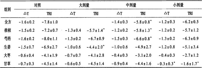 注:△T4:药后4h动物体温比基础体温的升高值(℃),TRI7:药后7h同体温——时间曲线下面积;与对照组比较*P<0.05(下同) 1-16-3 桂枝汤及其各组成药味对安痛定致低温大鼠体温的影响(x±s)