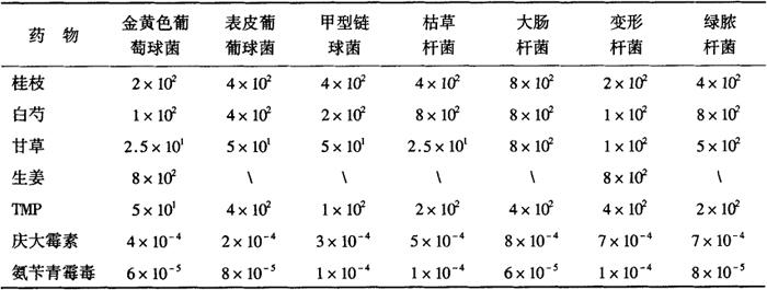 注:△T:全方、桂枝、芍药、生姜为药后3h体温比基础体温降低值;大枣、甘草为药后2h的相应值;TRI:全方、桂枝、芍药、生姜为药后6h内体温—时间曲线上面积;大枣、甘草为药后4h内的相应值 桂枝汤各组药味对体温的双向调节作用如表1-16-2、表1-16-3所示,桂枝、芍药的大、中、小三个剂量组使酵母所致发热大鼠体温降低,其平均体温反应高度△T4与对照组相比有显著性差异;此二药的三个剂量组也促使安痛定所致低体温大鼠体温回升,△T3与IRI6与对照组比较具有显著性差异,说明该药对体温呈现双向调节作用。 生姜对酵母所致发热大鼠体温升高无明显抑制作用,而大剂量组可明显促进安痛定所致低体温大鼠的体温回升,药后4~6h△T或TRI6与对照组比有显著性差异,说明该药有单向促进体温回升的作用。 大枣的大剂量组对酵母所致发热大鼠体温的升高有抑制作用,与对照组比有显著性差异。但在给药剂量范围内对低体温大鼠的体温回升未表现任何作用,说明该药具有一定单向解热作用。 炙甘草大、中二剂量对酵母所致发热大鼠体温升高有抑制作用,TRI7与对照组比有显著性差异。小剂量未呈现解热作用。该药量对安痛定所致低体温大鼠体温降低有抑制作用,△T或TRI4与对照组比有显著性差异。提示该药对体温呈现一定双向调节作用。 本实验结果提示,方中君药桂枝、臣药芍药既能解热又能使体温加速恢复,甘草亦呈一定的双向作用;然生姜仅能促进低体温恢复,大枣仅有较弱的解热作用,可能桂枝汤对体温的双向调节是方中诸药共同作用的结果。 值得提出的,在单味药的研究中,所用的小剂量仅为该药在全方(相当于临床等效量)中的用量,用量较低,一般在小剂量时已显示作用;但将它们的用量加大4倍,接近全方总量时,它们对体温的起效时间、作用强度或维持时间均不如全方,说明诸药有机组合成方的作用优于各个单味药物。 2.抗菌作用[4] 实验药物为桂枝、白芍、甘草、生姜各80g,按比例配制而成。桂枝汤以《伤寒论》的配方为准(桂枝10g,白芍10g,甘草3g,生姜10g,大枣4枚)。取TMP100mg微热溶于5mI蒸馏水中,然后加入桂枝汤中,制备成TMP桂枝汤混合液,其中桂枝汤TMP的浓度分别为4×103g/L、20g/L。 抑菌实验操作过程:实验药物平皿分为9排,依次为Ⅰ、Ⅱ、Ⅲ、Ⅳ、V、Ⅵ、Ⅶ7种药物浓度,另取4排分别作庆大霉素和氨苄青霉素阳性对照组及不加药液但均不接种细菌的阴性对照组。以上药物平皿做完全相同的两套,以实验结果完全吻合,不出现交叉为准。 除阴性对照外,其余培养皿划分为7个近等的区域,并分别编号,然后在每个区域中用定量接种环分别加入上述7种经校正浓度的菌悬液,每个区域接种3个部位,37℃培养24h,以细菌有无生长为判定指标,观察结果。 实验结果表明,桂枝汤中以甘草的抑菌效果最强,桂枝和白芍居中,而以生姜最弱。各味药对7种细菌的最低抑菌浓度(MI℃)见表1-16-4。 表1-16-4 桂枝、白芍、甘草和生姜单独抑菌的最低抑菌浓度MIC(g/L)