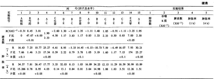 3.抗病毒作用 桂枝汤的正交设计法的组方分析[5] 正交设计:桂枝汤由5味药组成,药材均经鉴定,选用正交表L16(215),每味药为一个因子,随机分别置入1、2、5、8、14各列。每一因子取二个水平,“1”水平不给药,“2”水平给药。按表进行16组实验33]。各组的给药剂量,以各该药味在全方17.5g生药/kg总剂量(按体表面积换算,相当于成人临床用量)中的所占比例,相应称取,配合共煎浓缩到相同体积,冰箱保存,作灌胃用。为了能与整方的作用相比较,同时另设一全方组。 瑞士种封闭群小鼠,雄性,体重14~16g或18~22g,随机分组,每组10只。 实验指标:流感病毒性肺实变(肺指数);感染动物血浆炭粒清除率(K值);感染动物的脾重(系数);角叉菜胶性足肿张(肿胀率)。实验方法均按实验室常规。前三项,先以15LD50的流感病毒亚洲甲型鼠肺适应标FM1滴鼻感染,感染后当日开始给药,连续4d后进行测定或剖验。第4项,于小鼠左右足跖皮下注入角叉菜胶前1h,灌胃给药一次,致炎后1~6h分别测足跖容积,计算肿胀率。 直观分析和方差分析:各实验组测得的平均值列于表1-16-6右侧的四个纵列。表1-16-6下端的R值为极差,即(K2-K2)/8,K1、K2分别代表“1”水平和“2”水平对应的实验所得数据的总和,R值的正负和大小,反映了药味效应的差别和强弱。如肺指数为正值,说明药物能抑制流感病毒性肺炎,值越大,抑制作用越强;吞噬活性K为正值,说明对RES吞噬功能有抑制作用;脾系数为正值,说明可使脾脏重量降低;肿胀率为正值,说明有抗炎作用。如果为负值,则作用相反。 表1-16-6 正交设计及效应计算表