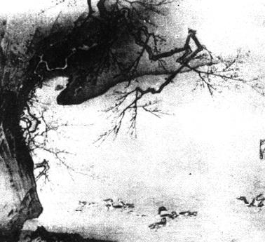 | 释义 | 梅石溪凫图 【作品赏析】: 马远善作边角之景,往往画不满幅。 此图为花鸟小景,仅画崖石一角、春水一湾,悬壁上有盘根错节梅树两株,枝头众花凌空映水而发。溪中碧波涟漪,三五成群的野凫追波逐浪而戏。群凫左右相呼,顾盼有情。 那只落在后面的野凫,惟恐自己远离伙伴,奋力鼓翅紧追而来。游在前边一只母凫,携带著五只幼雏学泳于水。其中一只幼凫卧伏母背,其余四只紧依母旁不肯轻离,宛若人间母子情爱。 此幅剪裁新巧,布景疏阔。山石用大斧劈皴,梅树枝干转折方硬,笔力恣健,梅花用色簇点而成,略写其意。唯野凫的画法,稍作细密的用笔,但和一般院体的工致画风自是不同。 。