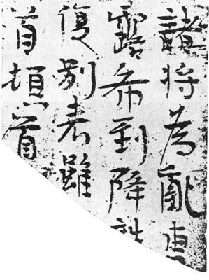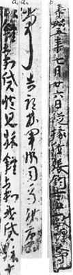 【简介】:  发掘于楼兰的魏晋简册。此三简,a1:23.7×1.2cm,爲晋泰始五年(269)十一月五日书。释文:“以籴穀贷臧见綵籴穀我贷綵十八疋谨案文书”;a2:17×1.4cm,释文:“当告部曲军假司马□康。”b:晋泰始五年(269)七月二十六日书。释文:“泰始五年七月廿日从椽位张钧言敦煌大守。”刊入日本《书道全集》(三)。 【赏析】:   (一)新疆出土的魏晋散简,草书,各简字数不等。魏晋草书承两汉草书而来。由章草而变爲眞草,爲今草之始,然而笔致古质、字字分写,有明显的章草痕迹。散简非一人所书。故风格有所不同。如简a1:“以籴入穀”简笔致厚实,著墨浓重,多以点代画,点画大都不连缀,有章草的特点。a2:“当告”简草法精能,运笔娴熟,笔画相连,转折入妙。“当”字长笔长至二字,爲今草所无,亦古草法也。 (二)“泰始五年”简字在行草之间,各字神态自若,行气相贯。自“泰”至“日”用笔迟而重,以下各字用笔疾而轻。“从”字多用草字点法写成,点画顾盼有致:“张”字“弓”“长”错落,收放有序:“钧”字“金”密而“匀”疏,主次分明。此简可谓魏晋行书代表作。 |