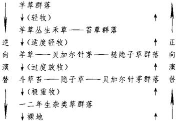 如羊草草原长期放牧,牧草高度降低,草被破坏,土壤沙化。放牧停止后,草地得以休养生息,逆向演替转向正向演替,其次生演替系列如下图: