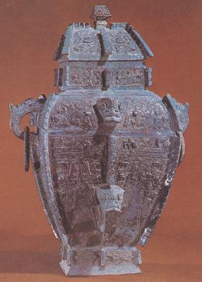◎盛酒或盛水器/西周早期 1964年河南洛阳北窑机瓦厂出土 通高50.3厘米 口长13厘米/洛阳市文物工作队藏 ●此器体高,近方形。 盖及纽为四阿形,上饰饕餮纹。颈高而方,上饰浅夔纹,眼为小乳钉。 肩圆角,满饰夔纹,中间有立雕小兽头。 兽头有阔口鼻小眼和向外弯曲的宽角。 肩部两侧还有兽耳衔环,器腹下敛而高,上部饰夔纹,下部饰蕉叶纹,中间饰立雕小兽头。腹下为方形圈足,上饰夔纹,底端外撇。 器自盖至圈足四角及中间共有八道矮扉棱。此器造型盖小、腹膨、身高,给人以庄重威严之感。 自纽至足节奏鲜明和谐,肩及腹部装饰多,变化丰富,愈显华贵。 满身纹饰,形态各异,突出了肩及腹部。肩腹部的兽头、兽身衔环引人注目。此罍做工精细,虽多扉棱不失完整。 盖内及口内有对铭“母 ”二字。 |
