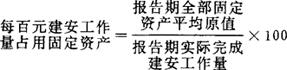 | 释义 | 每百元建安工作量占用固定资产 指建筑安装企业报告期每百元建安工作量所占用的固定资产原值。 它反映建筑安装企业全部固定资产平均原值与实际完成建安工作量的比例关系,是考核建筑安装企业固定资产利用效果的指标。其计算公式如下: