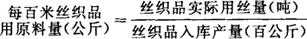 指每生产100米丝织品耗用折合公定回潮的各类天然和化学丝公斤数。是一种物质消耗和技术经济指标,反映企业的原材料耗费和节约水平。其计算公式为: