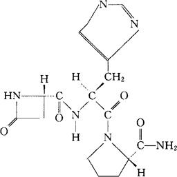| 释义 | 氮替瑞林 C15H20N6O4=348.36 CAS-95729-65-0 (-)-N-[[(2S)-4-氧-2-氮杂环丁基]羰基]-L-组氨酰-L-脯氨酰胺。 (-)-N-[[(2S)-4-oxo-2-azetidinyl]carbonyl]-L-histidyl-L-prolinamide. 促甲状腺激素释放激素。 阿泽内酰胺,氮杂瑞林。 Azetirelin. INN,USAN.