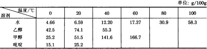 又称二氯化汞、升汞、氯化汞。 无色斜方晶系针状晶体。相对分子质量271.50。 相对密度5.44(25℃)。熔点276℃。 沸点302℃。溶于水、乙醇、甲醇、吡啶、乙醚、丙酮、苯、氯仿、二硫化碳、二噁烷、乙酸。 溶解度如下表。