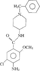 C20H24ClN3O2=373.88 CAS-55905-53-8 4-氨基-5-氯-2-甲氧N-[1-(苯基甲基)-4-哌啶]苯甲酰胺。 4-Amimo-5-chloro-2-methoxy-N-[1-(phenylmethyl)-4-piperidinyl]benzamide. 4-氨基-N-(1-苄基-4-哌啶基)-5-氯-邻-茴香酰胺。 4-Amino-N-(1-benzyl 4-piperidyl)-5-chloro-oanisa-mide. 镇吐药。 用于胃溃疡。 克立波必利,苄派芳酰胺,苹果酸克立波必利。 Clebopride,Cleboril,LAS9273. INN,USAN.