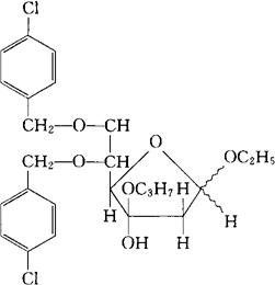 | 释义 | 氯苄苷[中] C25H32Cl2O6=499.43 CAS-29899-95-4 5,6-双-O-(对-氯苄基)-3-O-丙基-D-呋喃葡萄糖苷。 Ethyl5,6-bis-O-(p-chlorobenzyl)-3-O-propyl-Dglucofuranoside. 周围血管扩张药,消炎药。用于慢性静脉功能不全的对症治疗和血栓形成后的综合征。 氯苯西特。 Clobenoside,Ba-43853,Arvigol,Floganol. INN,USAN,MI.