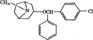 | 释义 | 氯苯托品 C21H24ClNO=341.88 CAS-5627-46-3 3-[(对-氯-α-苯基苄基)氧]托烷。 3-[(p-Chloro-α-phenylbenzyl)oxy]tropane. 3-[(4-氯苯基)苯甲氧]-8-甲基8-氮杂双环[3.2.1]辛烷。 3-[(4-Chlorophenyl)phenylmethoxy]-8-methyl-8-azabicyclo[3.2.1]octane. 抗组胺药,抗变态反应药。 氯苄苯托品醚。 Clobenztropine,SL-6057,Teprin. INN,USAN,MI.