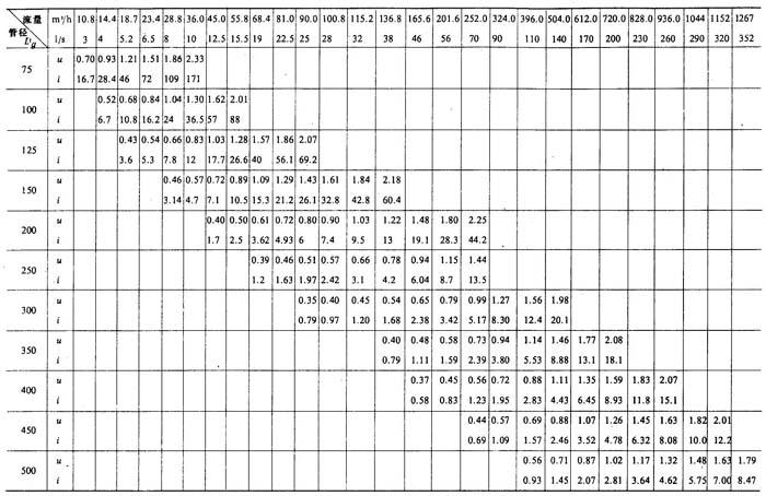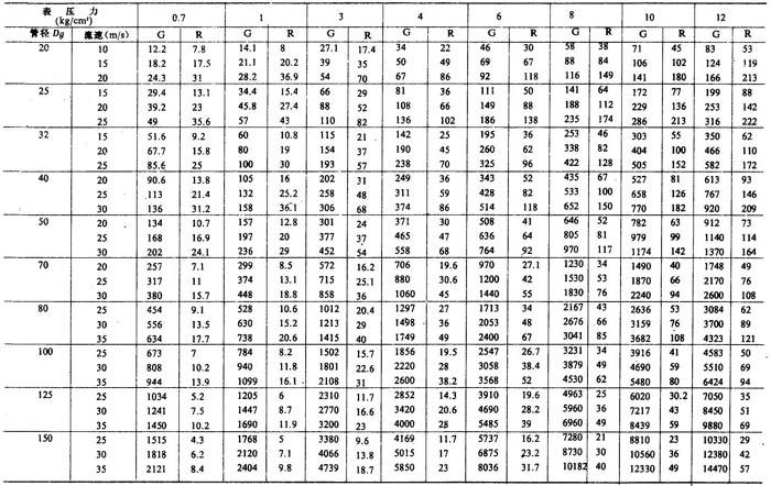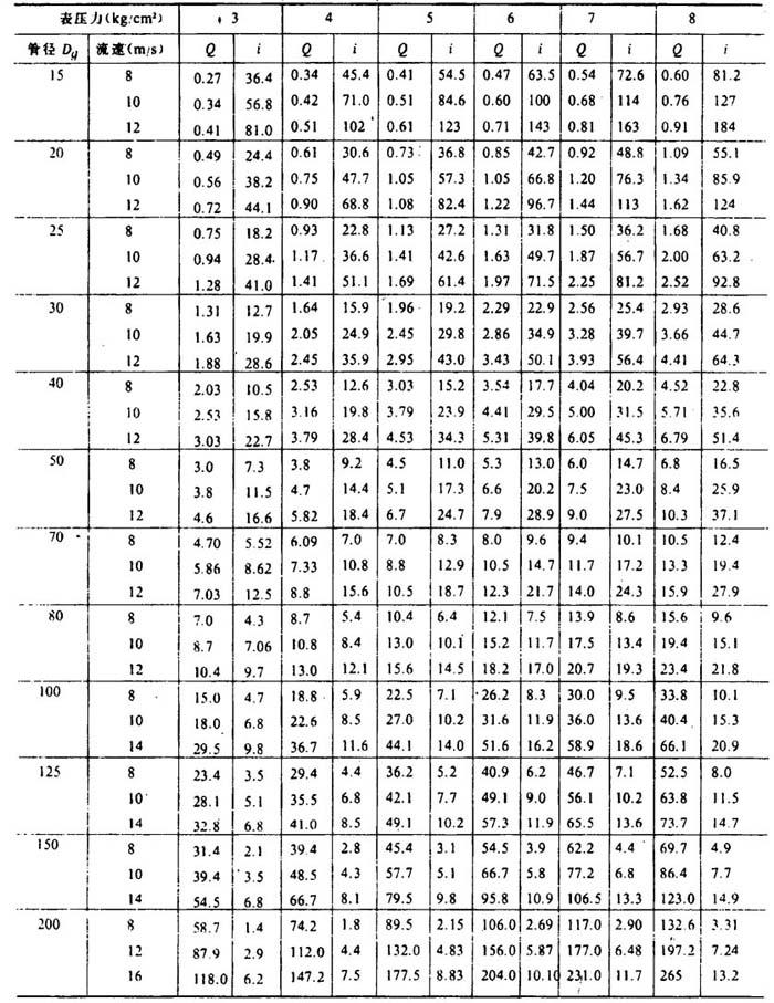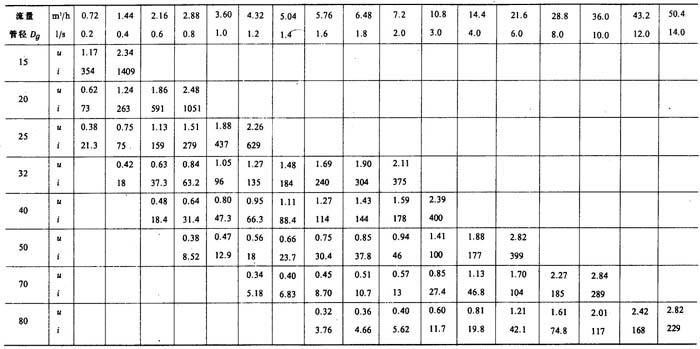 [说明]上述摩擦系数法计算比较繁琐,可通过引进水力坡度i的概念使计算直管阻力的方法简化。水力坡度i表示流体在管道中每流动1m所消耗的压力损失,与管道的材质、管壁粗糙度、管径大小、介质温度等有关。i的值是在特定条件下,通过实验计算求得的,在实际工作中,为使计算工作进一步简化,可直接从已编制好的管径计算表中查取,参考表2-5-7~表2-5-10。 表2-5-7 给水钢管计算表  注:u-流速(m/s) i-单位管长压力损失(mmH2O/m) 表2-5-8 给水铸铁管水力坡度i计算表  注:u-流速(m/s) i-单位管长压力损失(mmH20/m) 表2-5-9 蒸汽管道水力坡度i计算表  注:G-流量(kg/h) R-单位管长的压力损失(mmH2O/m) 表2-5-10 压缩空气管道水力坡度i计算衰  注:Q-流量(m3/min);i-单位管长的压力损失(mmH2O/m) [注意]在表2-5-7给水钢管计算表中,管径只列到Dg80,对于更大的管径,可从表2-5-8给水铸铁管计算表中查阅。由于钢管的内径较同规格的铸铁管稍大,管壁也较光滑,所以,按铸铁管查得的流速u和单位管长压力损失i,应加以修正,修正系数见表2-5-11 表2-5-11 使用钢管时的修正系数   式中 H1——直管阻力(mH2O) i——水力坡度,即单位管长的阻力(mmH2O/m) L——管道长度(m) |