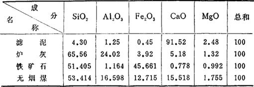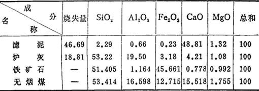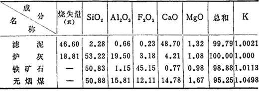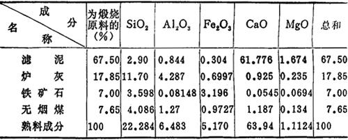 | 释义 | 水泥生产配料计算 采用拼凑法,此法是根据原料的成分,算出生料的成分,再考虑煤灰的掺入,计算出熟料的成分和率值。如不符合所要求的率值范围,则需调整原料的配比,重新计算,这样直至达到要求为止。现以滤泥、炉渣、铁矿石三种原料配料为例,计算如下。 1.原燃料的化学分析 表7-80 原燃料的化学成分