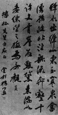 这幅作品,结体上呈左抑右仰之势,纵横交错,或有似东坡之处。如“波”、“许”、“丈”等字,向右上倾斜,体势略扁;又如“绛”、“泉”、“靑”、“崖”等字,体势拉长。整体上用笔洒脱,点画狼藉,自然流畅,不拘小节,显示了他极力开拓的胆识。守敬曾学过欧体,我们从这幅作品中好像很难找出他师法欧体的半点踪迹。然而,敢于叛师,这正是他的高明之处。 |