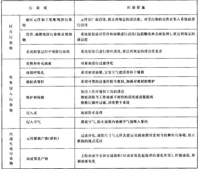 | 释义 | 污染源及控制措施 液压系统油液中的污染物来源是多方面的,可概括为系统内部固有的,工作中外界侵入的和内部生成的。为了有效地控制污染,必须针对一切可能的污染源采取必要的控制措施。表3.4-1归纳了可能的污染源及相应的控制措施。 表3.4-1 污染源与控制措施