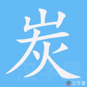 炭,金文=(厂,山崖)+(炎,大火),表示在山崖间伐木烧火。篆文=(山林)+(厂,山崖)+火(燃烧),造字本义:由大量木材不完全燃烧而制成的、一种黑色多孔的含碳固体。隶书误将(山崖) 写成(又,抓)。