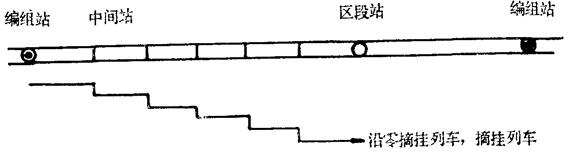 | 释义 | 沿零摘挂列车 运行于一个铁路区段,并在区段内中间站进行零担货物装卸作业和车辆摘挂作业的列车。沿零货物装卸作业,是指在区段内组织沿零车往返挂运,随时吸收沿途中间站所发送的零担货物,运送到中转站换装到整装零担车内,或运到列车行驶范围内指定到站,以及将运来的零担货物转运到沿途指定的中间站卸下。车辆摘挂作业,是指将区段内各中间站发送和到达的车辆编在列车内进行沿途摘挂作业,服务于中间站货物运输。根据区段内各中间站所产生的零星车流情况,或服务于整个区段各中间站,或服务于区段内个别固定地段,或服务于指定的摘挂站。两类作业合并组成列车为沿途货主服务。这类列车所运货物一般运距短,批量小,适宜公路、水运分流,铁路不宜大量发展。图示如下: