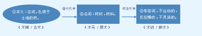 | 释义 | ![]() 树木;木头。常用于固定词组中,或用作语素构成合成词。 独~不成林|~已成舟|树~|楠~|醒~。 麻木。 a.作谓语。 天太冷,双脚都~了|舌头~了,什么味儿也辨不出。 b.作补语。 水冷得浸骨头,手指都冻~了|时间太长,脚都站~了。 【词语】 木板 木材 木柴 木雕 木耳 木筏 木工 木刻 木料 木乃伊 木讷 木偶 木排 木然 木已成舟 木鱼 字源解说 木,甲骨文 附 文言版《説文解字》:木,冒也。冒地而生。東方之行。从屮,下象其根。凡木之屬皆从木。 附 白话版《说文解字》:木,冒突。冒地而生。五行之中,东方属木。字形采用“屮”作边旁,下部象它的根。所有与木相关的字,都采用“木”作边旁。 引申线索 ![]() 【字族索引】 木 【同音字】 mù |