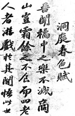 | 释义 | 洞庭春色赋 【作品赏析】: 此帖与《中山松醪赋》二帖为苏轼的代表作品。 明张孝思云:“此二赋经营1笔,结构严整,郁屈瑰丽之气,回翔顿挫之姿,真如狮蹲虎踞。”王世贞云:“此不惟以古雅胜,且姿态百出,而结构谨密,无一笔失操纵,当是眉山最上乘。观者毋以墨猪迹之可也。” 东坡书多用卧笔,故偏肥。 欧阳修不喜肥字,夸杜了美的“独贵瘦硬。”东坡作诗曰:“杜陵论书贵瘦硬,此论未公吾不凭。丰妍瘦硬各有态,飞燕玉环谁敢憎。”这虽是自辩,但不能不说是持平之论。 苏轼的字,给人以“大海风涛之气”、“古槎怪石之形”的艺术美感,是与其卧笔偏锋的笔法墨法分不开的。 。