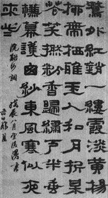 | 释义 | 浣溪沙词轴 【简介】: 淸·郑簠书。纸本。隷书。《浣溪沙》词一阕,作于康熙戊辰(1688)年。凡六行,共五十八字。173.6×89.6cm。上海博物馆藏。刊于《书法丛刊》(十三)。