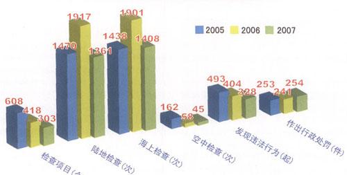 中国政府积极实施主要入海河流的污染防治计划和重点海域的环境保护计划。 继渤海之后,中国政府于2005年启动了长江口及毗邻海域、珠江口及毗邻海域的污染治理工作,在长江口和珠江口及其毗邻海域开展了河海统筹、陆海兼顾的陆域、海域同步的环境监测和调查工作。 中国政府严格执行海洋工程和海上倾废的审批制度,强化对倾倒活动的执法监视,加强海洋环境监测。国家批准了《赤潮灾害应急预案》和《海洋石油勘探开发重大溢油应急计划》,并纳入国家灾害应急管理体系,初步建立了海洋灾害应急机制。加强了船舶污染防治和危险品运输管理,积极推进海上船舶溢油应急体系建设。目前已建有国家级海洋自然保护区29个,面积约2.5万平方公里,此外还建立了8处海洋特别保护区,保护对象包括多种珍稀濒危海洋生物物种、典型海洋生态系统及海洋景观地貌和自然历史遗迹等多种有价值的海洋资源。全国沿海防护林体系一期工程已经完成,工程区森林覆盖率由24.5%上升到35.5%。 “全国沿海防护林体系二期工程建设规划”正在实施之中。 海洋生态保护行政执法情况对比(2005~2007年)