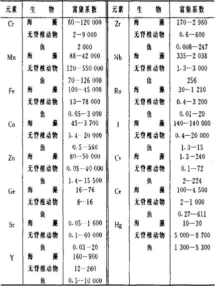 式中,Cb是生物体中该元素的含量;Cw是该生物所栖环境水中该元素的浓度。下表列出了海洋生物对部分微量元素的富集系数。 海洋生物的富集系数(桧山、清水,1968)