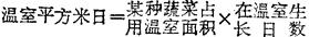 占用温室面积一平方米一日,为一个平方米日。如,某作物占用温室100平方米,在温室生长期为60天,则为6,000温室平方米日。 在同一周期、同一温室培植两种以上农作物时,温室平方米日是分配温室费用(如保暖用燃料、温室建筑物和设备的折旧与修理费等)的一种标准。 |